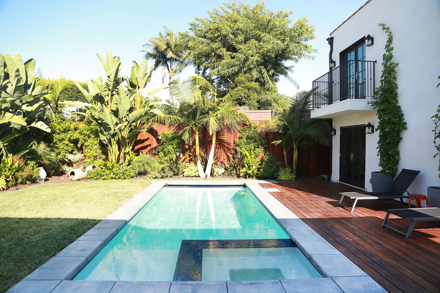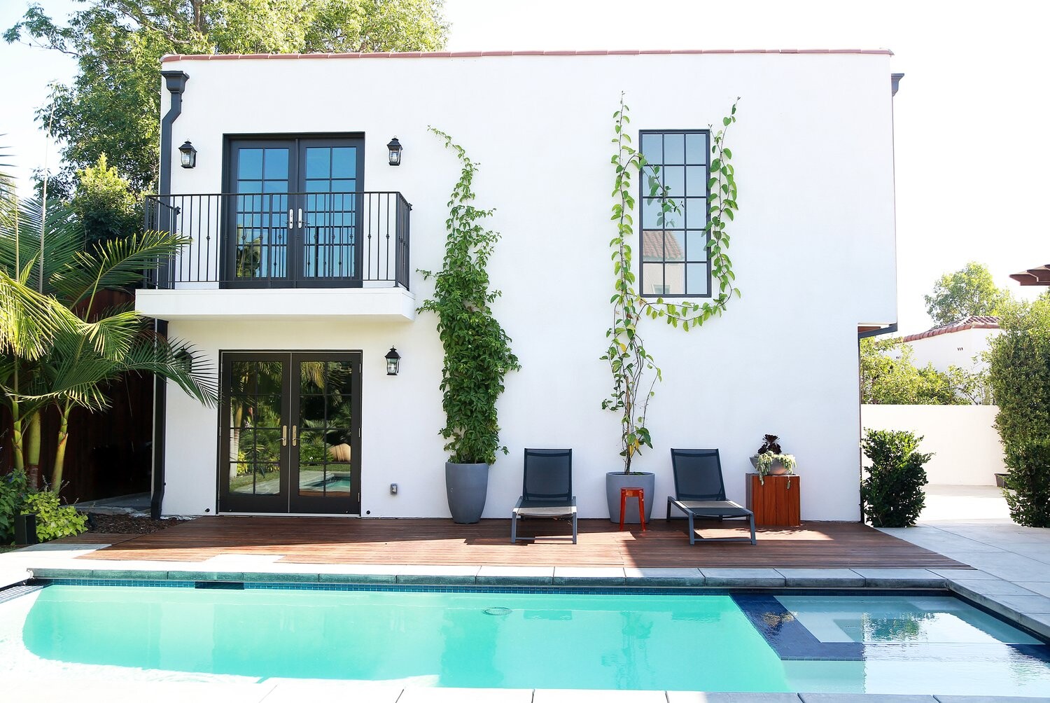 Larchmont Residence is a testament to the beauty of modern architecture, boasting a white stucco exterior that creates a stunning contrast with large, black-framed windows. The home's two-story design incorporates an inviting balcony, double doors leading to a deck area, and a swimming pool surrounded by a wooden deck. The use of tropical plants and climbing vines brings a touch of the natural world into the urban setting, creating an oasis of tranquillity. The interior design complements the exterior, with an emphasis on space, light, and premium materials. The home's entrance is marked by a charming wooden door, flanked by decorative light fixtures, inviting you into a world of luxury.